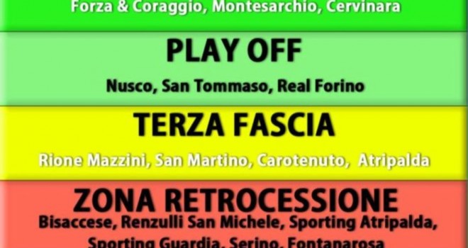 Posizioni di classifica tranquille con possibilità di attentare alla zona play off per il Rione Mazzini che, a nostro avviso, potrà fare la voce grossa quando tornerà a completa disposizione Bolognese. Nell'attesa Gianni Tucci si affiderà all'estro di Luigi Cinque, ai fratelli De Feo e ai nuovi Montuori, Pennetti e D'Argenzio. Stesso discorso per il San Martino le cui quotazioni per un posto agli spareggi salirebbero vertiginosamente solo se arrivasse una prima punta in grado di garantire quantomeno la doppia cifra. Rimanesse tutto invariato, con il sempre troppo solo Cioffi, seppur bravissimo, a sgomitare nelle aree di rigore avversarie, la squadra del duo Puzio-Curcio resterebbe un' eterna incompiuta. Cercano tranquillità, e molto probabilmente la otterranno, Il Carotenuto di mister Sena e l'Atripalda, ringiovanito dalla cura Mogavero.
